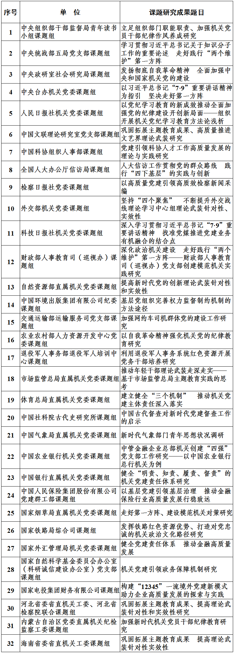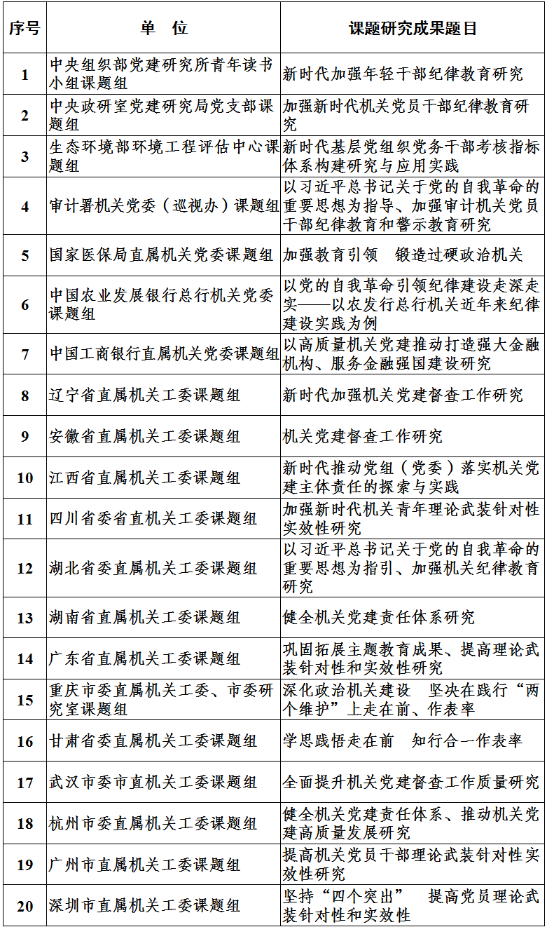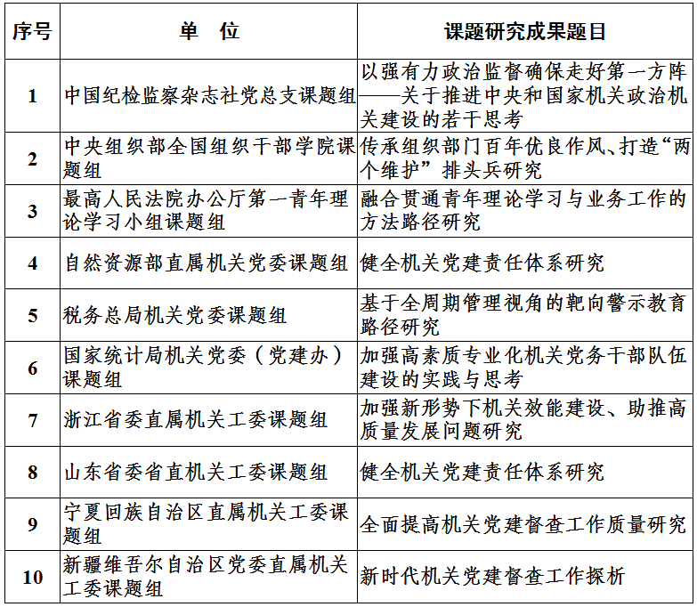 為深入學(xué)習(xí)貫徹習(xí)近平新時(shí)代中國特色社會(huì)主義思想和黨的二十大精神,認(rèn)真貫徹落實(shí)黨的二十屆三中全會(huì)精神,貫徹落實(shí)習(xí)近平總書記關(guān)于黨的建設(shè)的重要思想、關(guān)于黨的自我革命的重要思想,特別是關(guān)于機(jī)關(guān)黨建的重要講話和重要指示精神,扎實(shí)推進(jìn)機(jī)關(guān)黨建理論研究工作,助力全面提高機(jī)關(guān)黨建質(zhì)量,中央和國家機(jī)關(guān)工委機(jī)關(guān)黨建研究雜志社組織開展了2024年度課題研究工作。今年,共收到中央和國家機(jī)關(guān)各部門、地方各級(jí)機(jī)關(guān)黨組織、機(jī)關(guān)黨建研究雜志社特約研究員報(bào)送的課題研究成果347篇。按照公平公正原則進(jìn)行了初評(píng)和復(fù)評(píng),經(jīng)中央和國家機(jī)關(guān)工委審定,評(píng)選出一等獎(jiǎng)10篇、二等獎(jiǎng)20篇、三等獎(jiǎng)30篇、優(yōu)秀獎(jiǎng)60篇,優(yōu)秀組織獎(jiǎng)10個(gè)。