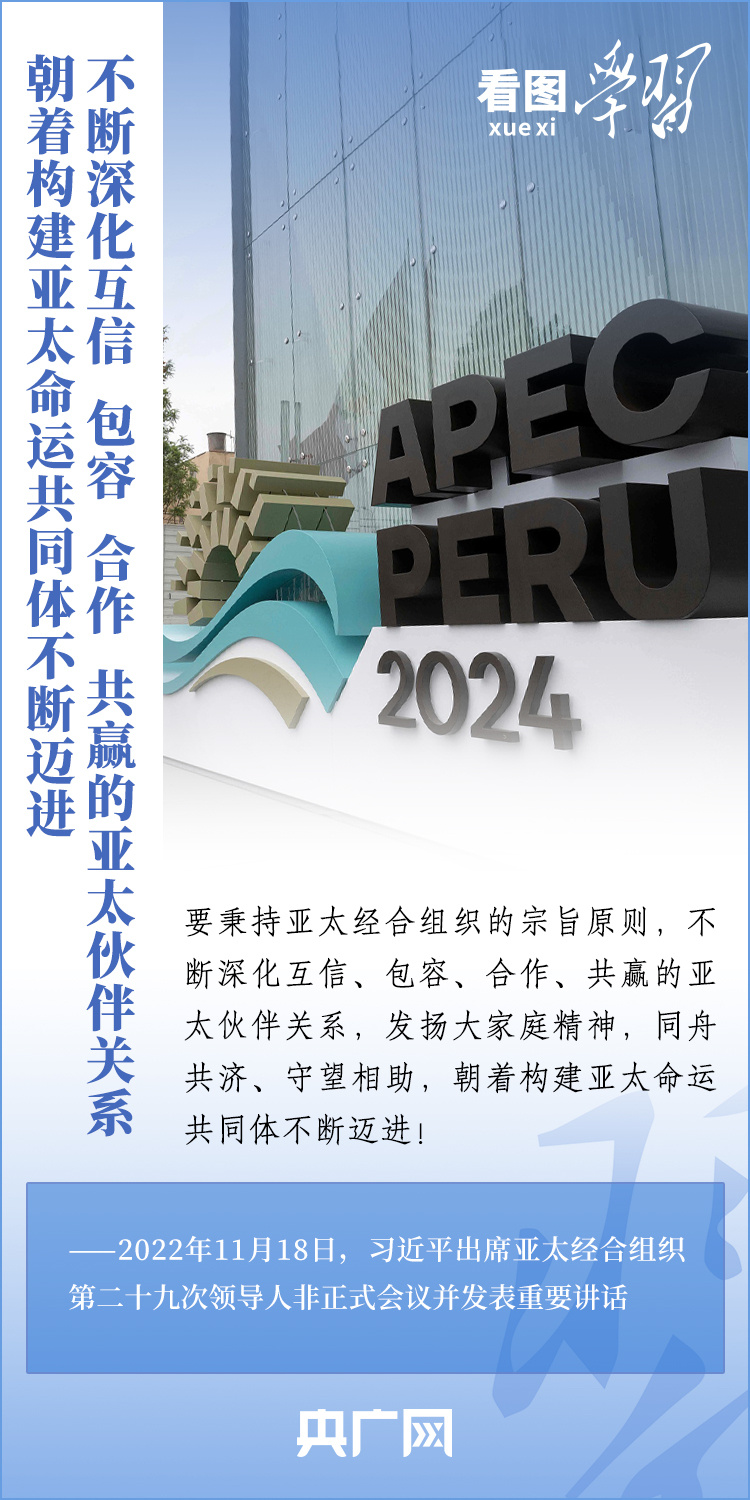 亞太經合組織(APEC)是亞太地區層級最高、領域最廣、最具影響力的經濟合作機制。11月13日至17日,習近平主席赴利馬出席亞太經合組織第三十一次領導人非正式會議并對秘魯進行國事訪問。從“亞太夢想”到“APEC方式”,從“亞太伙伴關系”到“亞太命運共同體”……2013年以來,習近平主席出席或主持歷次APEC領導人非正式會議,就全球及地區形勢、亞太區域合作、APEC未來發展等一系列重大問題闡釋中國主張,推動不斷深化互信、包容、合作、共贏的亞太伙伴關系,建設開放、活力、強韌、和平的亞太共同體。一起來學習!