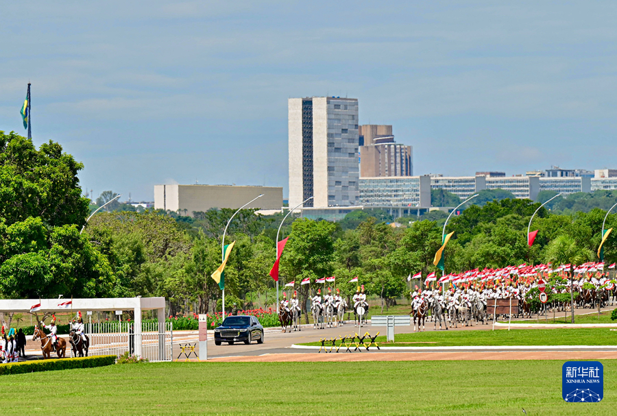 初夏時節(jié)的巴西利亞,天朗氣清。黎明宮內(nèi),綠草如茵,450名威武禮兵整齊列隊。在120名龍騎兵護衛(wèi)下,習(xí)近平乘車抵達黎明宮前廣場。