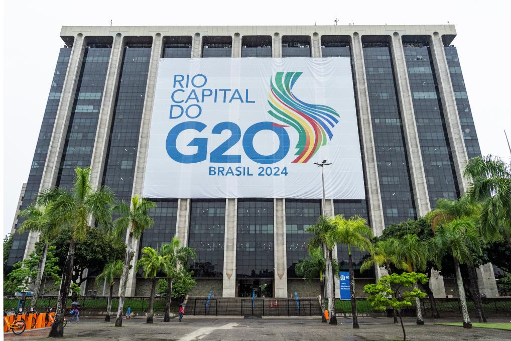 這是11月16日在巴西里約熱內盧市政府行政中心外拍攝的二十國集團領導人峰會標識。新華社記者 王天聰 攝