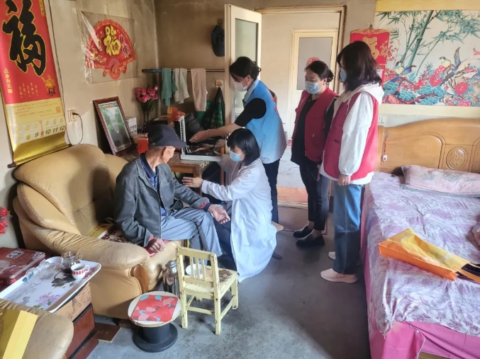 基層民政工作人員為行動不便的困難群眾提供上門體檢與家庭保健服務。
