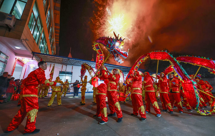 2024年2月10日,浙江省諸暨市安華鎮(zhèn)礦亭村村民進行舞龍表演,慶祝春節(jié)。新華社記者 徐昱 攝