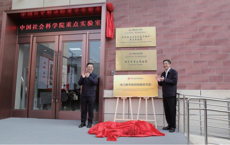 >> 2024年11月5日,作者(左)為中國社會科學院科技考古與文化遺產保護重點實驗室、語言學重點實驗室和中國社會科學院大學冷門絕學協(xié)同創(chuàng)新研究院揭牌。