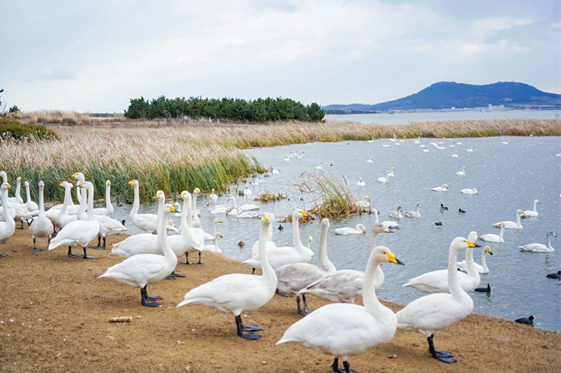11月,越冬的大天鵝成群集結(jié)在榮成市俚島鎮(zhèn)煙墩角村。