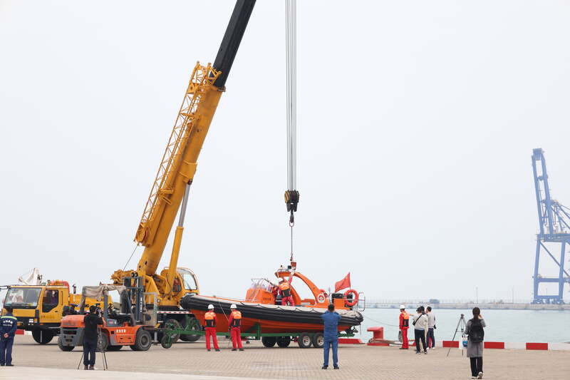 參觀期間,救援隊突然接到了海上救援任務,救援人員迅速登上救助船,救助船從陸地被放至海上,迅速前往事發地點。