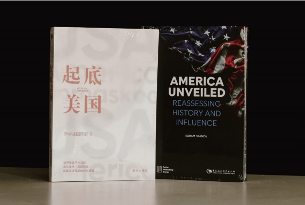 由新華社國際部編著的中文圖書《起底美國》、英文圖書《帝國真相》。
