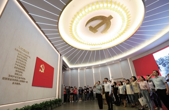 黨員在上海中共一大紀念館里重溫入黨誓詞。