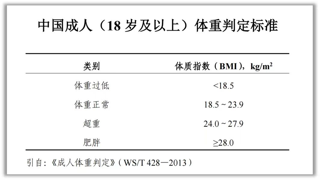 我國(guó)健康成年人的BMI正常范圍為18.5kg/㎡≤BMI<24.0kg/㎡,BMI<18.5kg/㎡為體重過(guò)低,24.0kg/㎡≤BMI<28.0kg/㎡為超重,BMI≥28.0kg/㎡為肥胖。