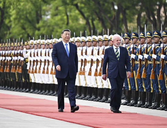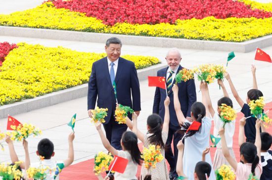 5月13日下午,國(guó)家主席習(xí)近平在北京人民大會(huì)堂同來(lái)華進(jìn)行國(guó)事訪問(wèn)的巴西總統(tǒng)盧拉舉行會(huì)談。這是會(huì)談前,習(xí)近平在人民大會(huì)堂東門(mén)外廣場(chǎng)為盧拉舉行歡迎儀式。新華社記者 饒愛(ài)民 攝