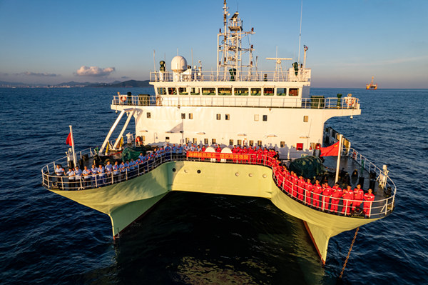 聲學所科研人員在大海上向祖國立下“深耕藍色國土,建設海洋強國”的莊嚴承諾。