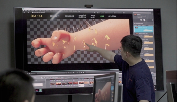 影片《哪吒之魔童鬧海》的特效制作團隊研究特效畫面細節。