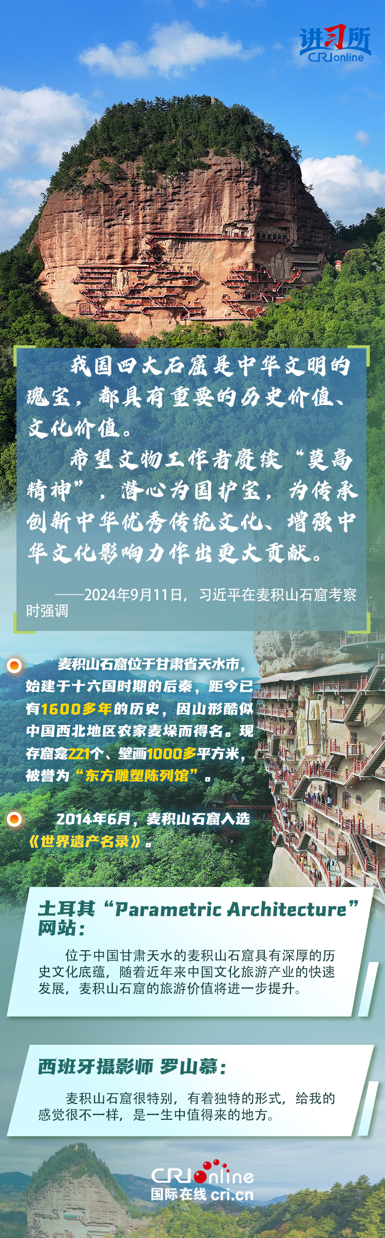 龍門石窟被聯合國教科文組織評價為“中國石刻藝術的最高峰”,與敦煌莫高窟、云岡石窟、麥積山石窟并稱為“中國四大石窟”,具有重要歷史價值、文化價值。近年來,習近平先后考察了中國四大石窟。對這些承載著中華民族文化基因和血脈的文物和文化遺產,習近平強調,“保護好、傳承好歷史文化遺產是對歷史負責、對人民負責。”