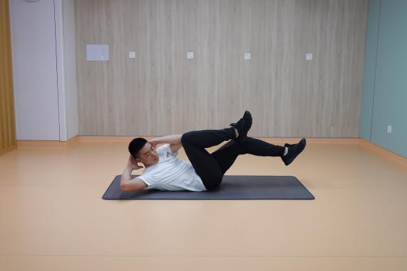 2、自行車式仰臥起坐:仰臥在瑜伽墊上,雙腿抬起屈髖屈膝呈90度,雙手放在耳后,一側肘關節觸碰對側膝關節,左右交替為1次,一組進行10-15次,重復2-4組,組間休息60秒。