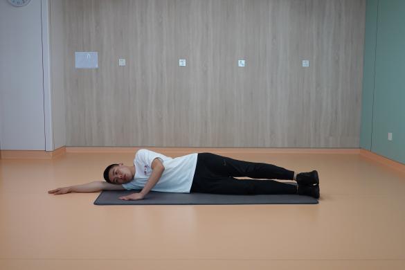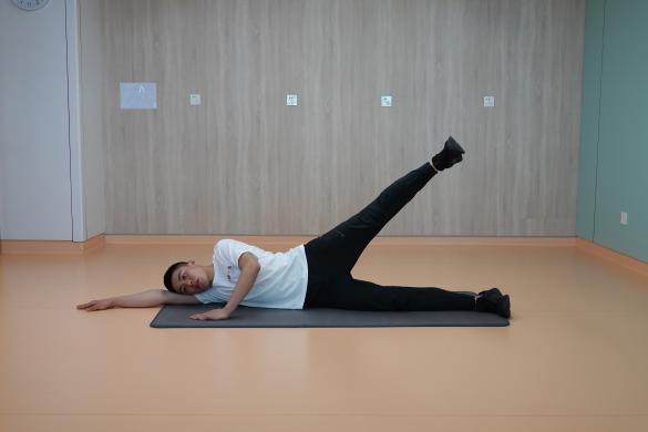 6、側臥抬腿:側臥位,雙腿伸直,上側腿緩慢向上抬起,感受大腿外側發力,保持上身穩定。一組進行10-15次為一組,交換對側重復,每側重復2-4組,組間休息30秒。
