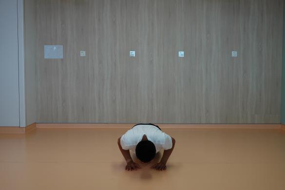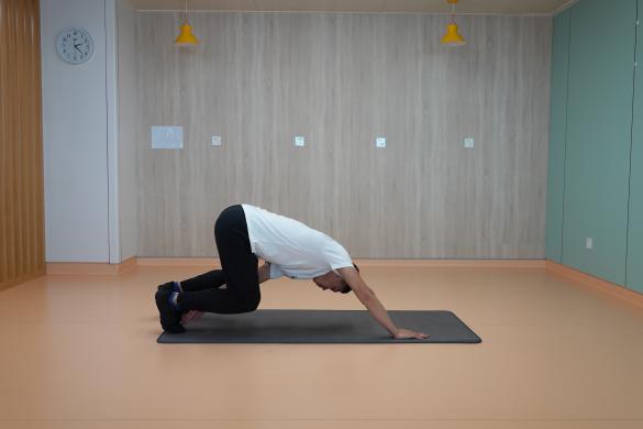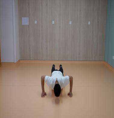 4、俯臥撐(窄撐):腰背挺直,雙腳腳尖及雙手撐地呈俯臥撐姿,雙手盡量靠攏,做窄距俯臥撐。10-12次為一組,做2-3組。