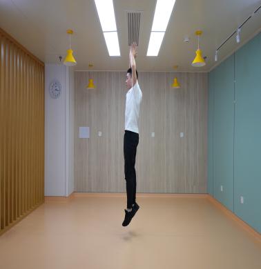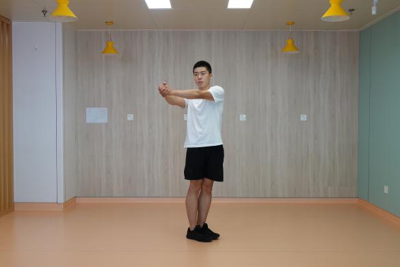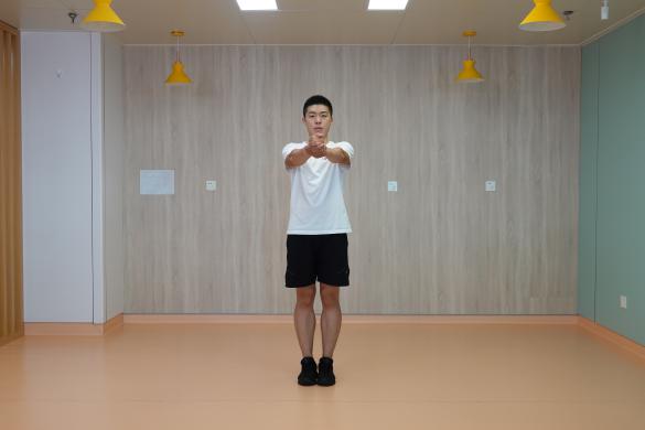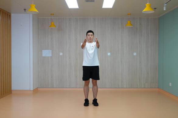 6、轉(zhuǎn)體跳:站姿雙腿并攏,腰背挺直,膝關(guān)節(jié)微屈曲,雙臂前平舉手臂伸直,雙手十指交叉,雙腳做向左/向右的跳躍,軀干及上肢向相反方向轉(zhuǎn)動,左右交替為一次。10-12次為一組,做2-3組。
