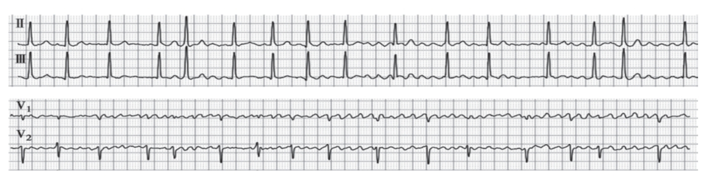 3、QRS波形態通常正常,當心室率過快,發生室內差異性傳導,QRS波增寬變形。