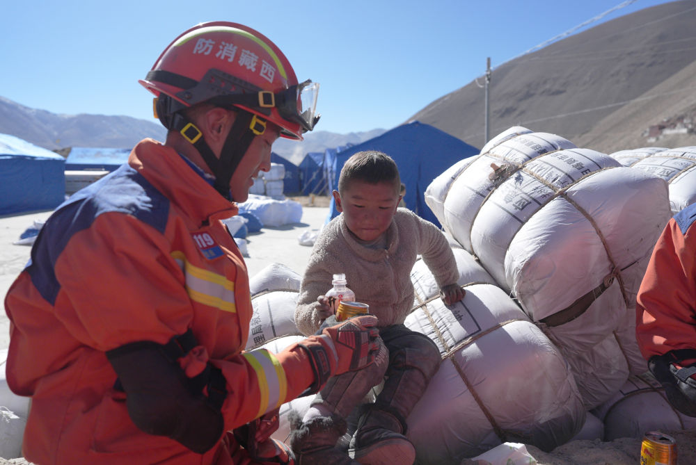 2025年1月8日,在西藏定日縣措果鄉(xiāng)塘仁村安置點,消防救援人員和小朋友互動。1月7日,西藏日喀則市定日縣發(fā)生6.8級地震。新華社記者 晉美多吉 攝