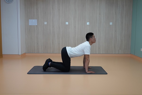(3)牛貓式:四足跪姿,頭部向胸骨方向內收,呈駝背姿勢,保持3-5秒,進行3-5次為1組,重復2-3組,組間休息60秒。