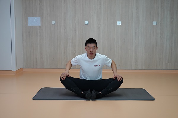 (4)蝴蝶式坐姿:坐在瑜伽墊上,雙腳腳心相對,軀干向下壓,保持3-5秒,進行3-5次為1組,重復2-3組,組間休息60秒。