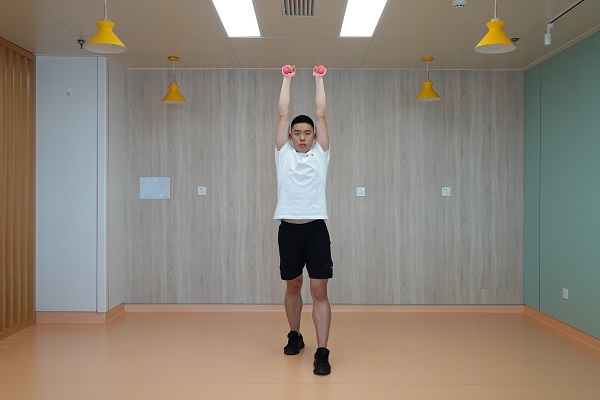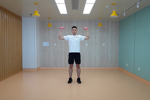5、分腿站立頭上推舉:兩腿前后開立,保持兩腿伸直,兩手握啞鈴手心相對,腰背挺直,肘關節屈曲啞鈴與肩關節在同一高度,兩手臂同時發力向上上舉至最高點,緩慢回到起始位置。10-12次為一組,做2-3組。