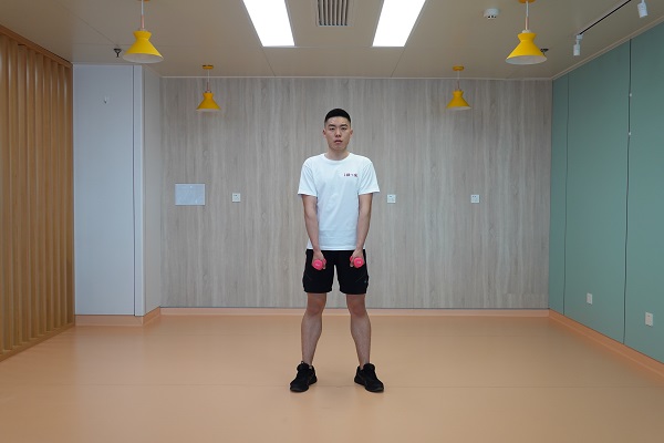 2、直臂上拉加轉向:雙腳開立與肩同寬,腰背挺直,雙手握啞鈴在身體前側,手心朝向身體,雙臂用力向上提拉至啞鈴與肩同高,手臂旋轉至肩關節外展90度,前臂與上臂呈90度姿勢,再緩慢回到起始位。10-12次為一組,做2-3組。