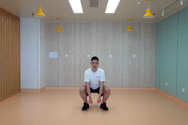 3、上拉負重深蹲:雙腳開立稍比肩寬,腰背挺直,雙手握啞鈴在身體前側,手心相對,向下下蹲至最低點后起身直立,雙臂提拉啞鈴至與肩同高,此時手心朝向身體。10-12次為一組,做2-3組。