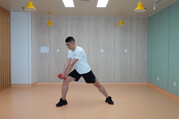 4、轉體(從下至上):雙腳分立,腰背挺直,雙手抓一只啞鈴,向一側斜下方,并伴隨下肢微屈及軀干旋轉,雙臂用力將啞鈴向斜上方提拉,并伴隨下肢及軀干旋轉。交換另一側繼續。10-12次為一組,做2-3組。
