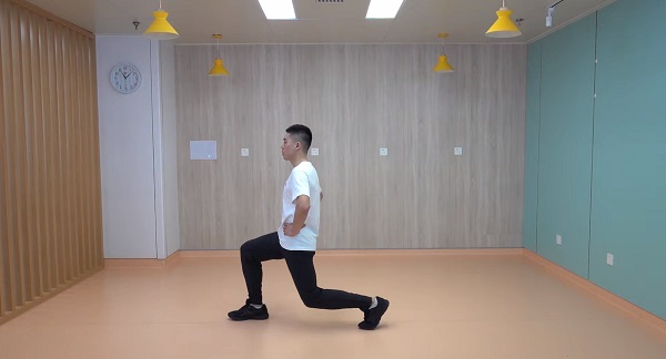 4、弓箭步:站姿,雙腳并攏,一腿向前跨出一大步,下蹲至前腿屈膝90度(膝蓋對齊腳尖),后腿膝蓋接近地面(不接觸),再起身還原,感受雙腿前側與后側發力,下蹲階段用時3秒,起身階段用時2秒,一組每側進行8-12次,重復2-4組,組間休息60秒。