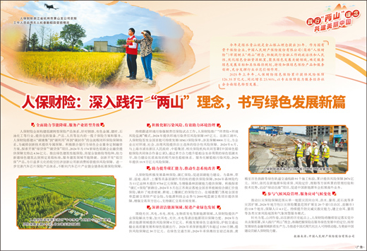 人保財險積極發展森林保險、碳匯保險,促進固碳能力建設。為森林、草原、濕地、海洋、土壤等具備固碳作用的標的提供保險保障,2024年森林險約為11億畝林木提供9754億元保障,為增強森林固碳能力提供保障。積極探索“碳匯+保險”新路徑,2024年5月在江蘇南京落地全國首單植被綜合碳匯價值保險,填補了地表植被、耕地、土壤碳匯的保險空白。在福建廈門落地全國首單藍碳交易財產安全險,為能源科技企業參與2000噸藍碳交易項目提供保障,增強交易雙方信心,支持碳匯交易市場發展。