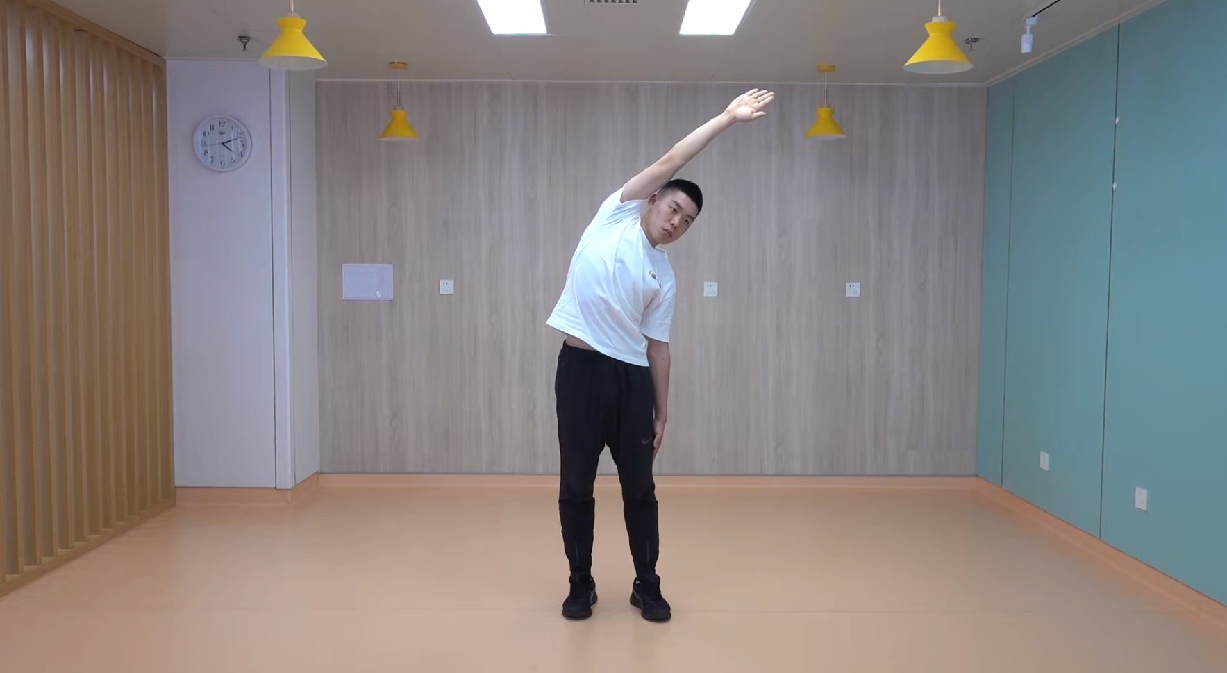 背闊肌伸展:站姿,單側(cè)手臂上舉,向?qū)?cè)拉伸,保持3-5秒,單側(cè)進(jìn)行3-5次為1組,交換對(duì)側(cè),重復(fù)2-3組,組間休息60秒。