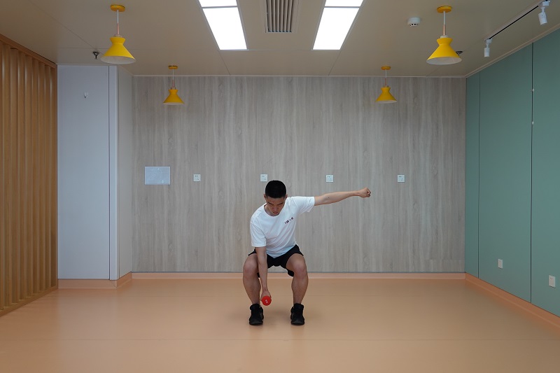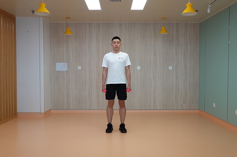 2、上拉負重深蹲:雙腳開立稍比肩寬,腰背挺直,雙手握啞鈴在身體前側,手心相對,向下下蹲至最低點后起身直立,雙臂提拉啞鈴至與肩同高,此時手心朝向身體。10-12次為一組,做2-3組。
