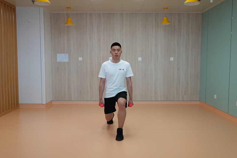 4、多方向箭步蹲:腰背挺直,雙腳開立與肩同寬,雙手握啞鈴于身體兩側,一側腿向前邁出一步做前箭步蹲,起身還原后,向側方邁出一步做側箭步蹲,起身還原后,再向后邁步做后箭步蹲。交換對側重復。10-12次為一組,做2-3組。