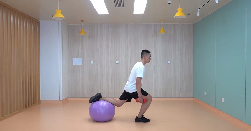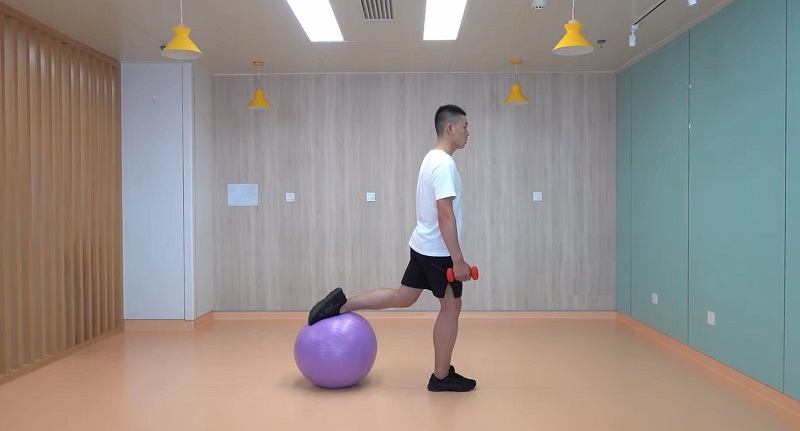 5、深蹲:一腿在球上,腰背挺直,雙手握啞鈴于身體兩側,一腳搭在后側瑜伽球上,腹部核心發(fā)力,向下下蹲至最低點,保持膝關節(jié)不超過腳尖,再起身還原。交換對側重復。10-12次為一組,做2-3組。