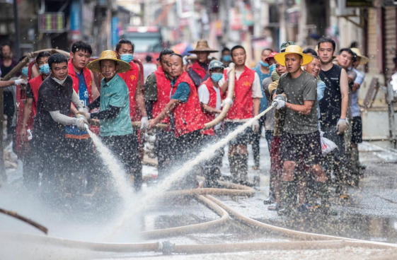 2025年6月30日,在貴州省從江縣丙梅街道俞家灣社區(qū),黨員干部和志愿者在合力清淤。自從江縣發(fā)生洪澇災害以來,當?shù)貜V大黨員發(fā)揮先鋒模范作用,積極投入搶險救災工作,幫助群眾盡快恢復正常的生產(chǎn)生活秩序。