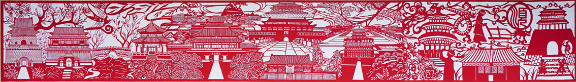 2022年,北京中軸線申遺進入關鍵階段,我和兩位傳承人決定用剪紙再現這條古都文脈。中軸線全長7.8公里,作品就做7.8米,這么大的剪紙,光是鋪開紙張就要5人配合。